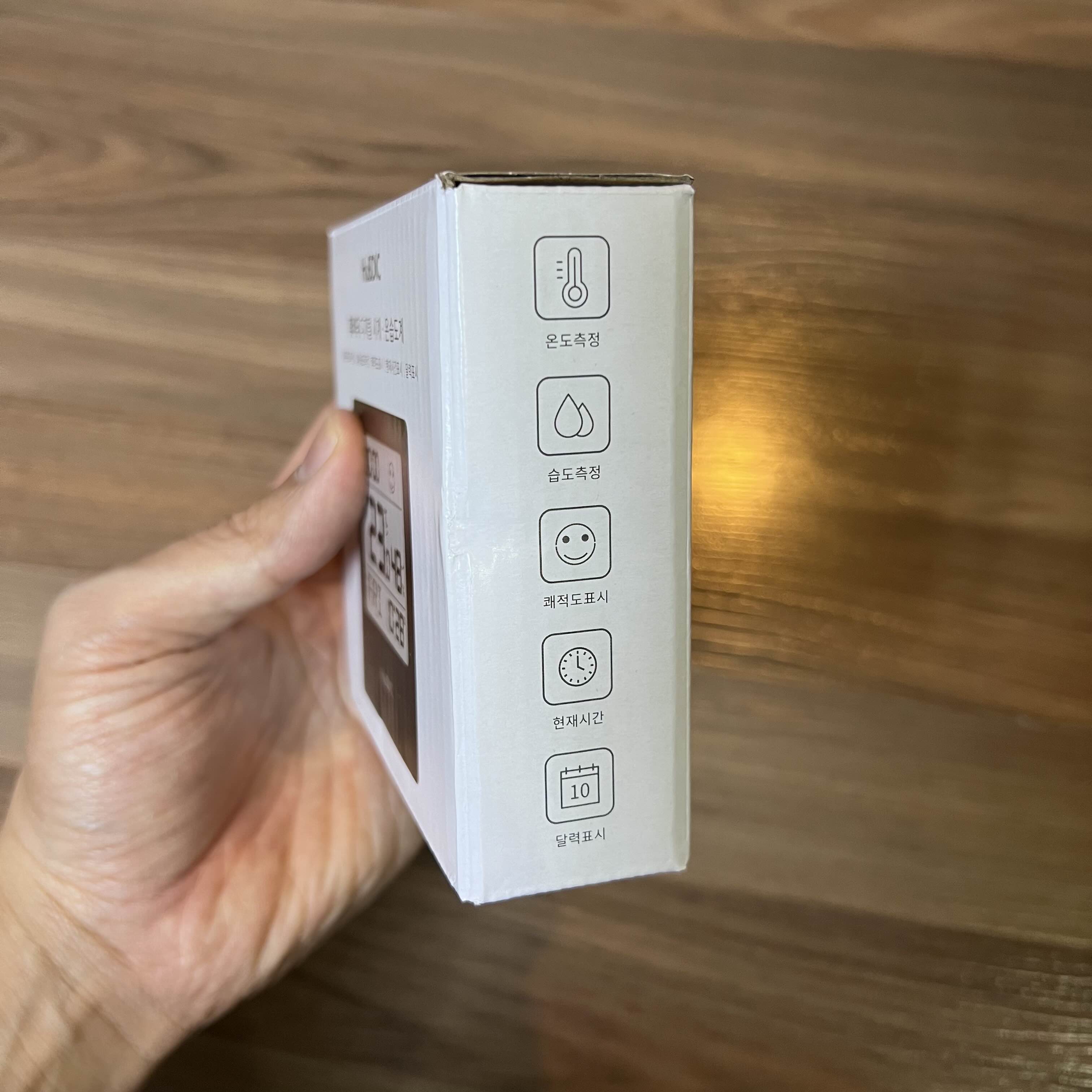 이 제품은 온도, 습도, 쾌적표 표시, 전자시간과 달력까지