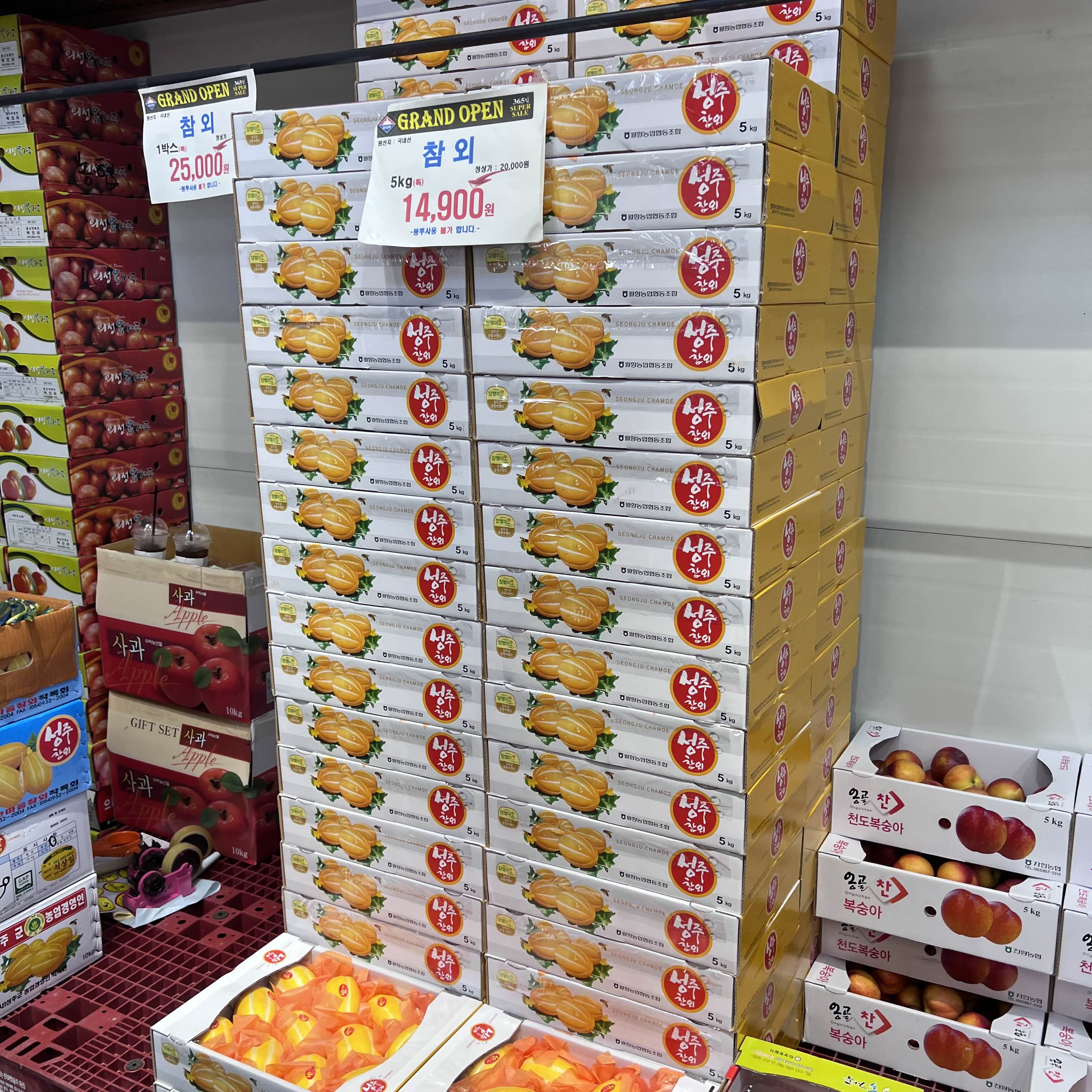 매장 입구에는 과일을 팔고 있습니다.